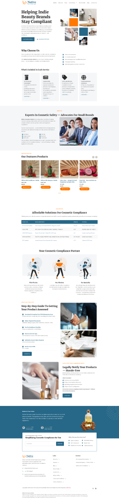 The site offers services such as Cosmetic Product Safety Reports (CPSRs), label and CLP compliance reviews, portal submissions, and pre-assessed formulations to ensure products are legally compliant and marketable.